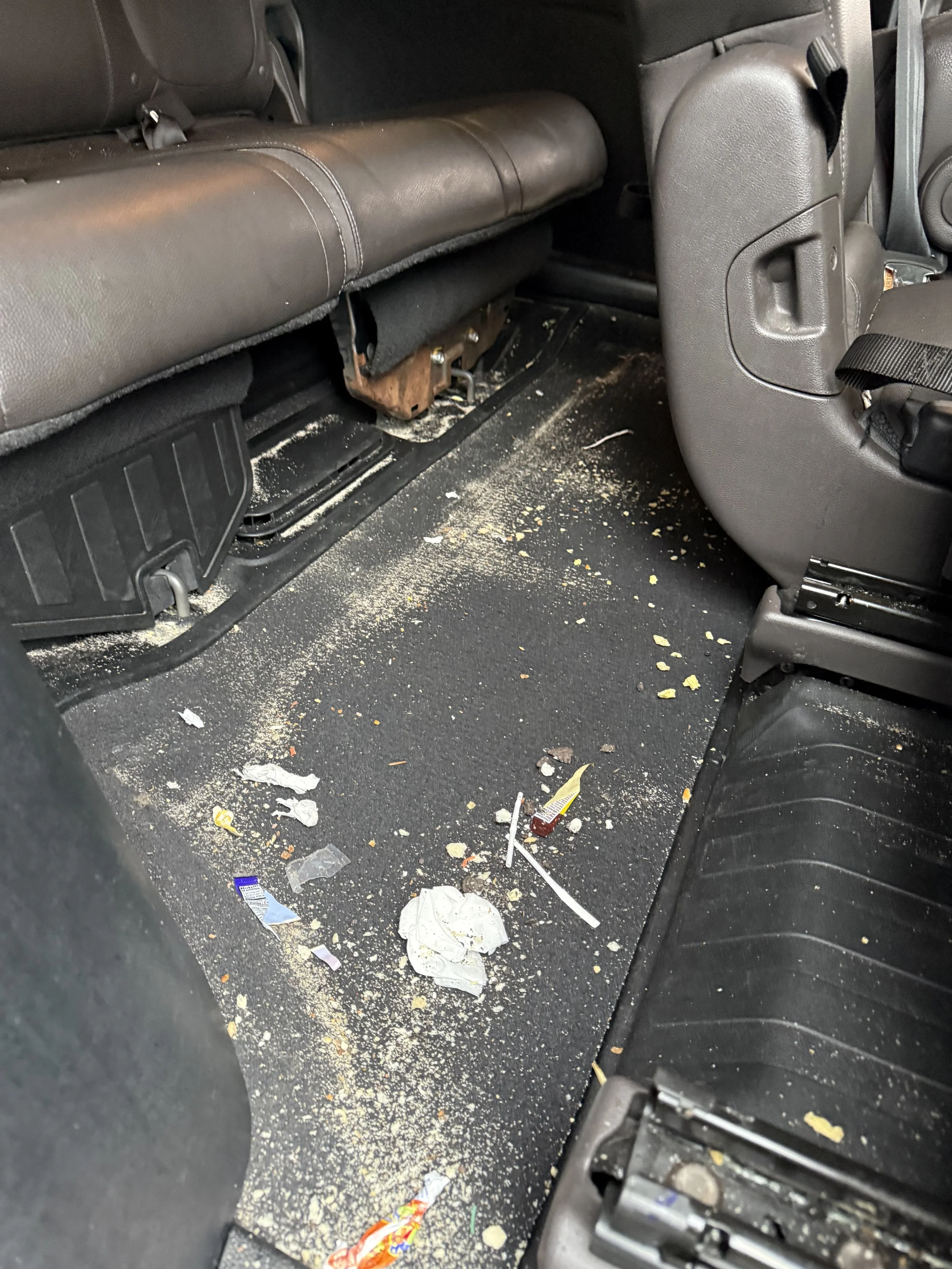 Trash, car seats, crumbs/sand, snow, driver’s seat